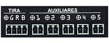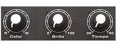 Menus de configuración y pulsadores. | Puesta en marcha y pausa de ciclo. | Mandos de ajuste de brillo, color y tiempos | Bornero de conexión de tiras RGB y monocromas | Puerto de expansión y contraste |