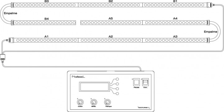Esta peculiaridad de las tiras led que a priori podria parecer un problema se puede contemplar como una ventaja, puesto que contrariamente a lo que podriamos esperar la diferencia de brillo de los chip led del ultimo tramo de la tira no es significativo comparados con los primeros. Esto nos permitirá montar hasta dos lineas de 5 metros de tira blanca para la fase "Día", que podremos manejar con el controlador NOCTURNE-1 sin añadir ningun accesorio (Amplificadores y fuentes de alimentación) simplificando el montaje y reduciendo el costo en equipos de manera significativa. | ||